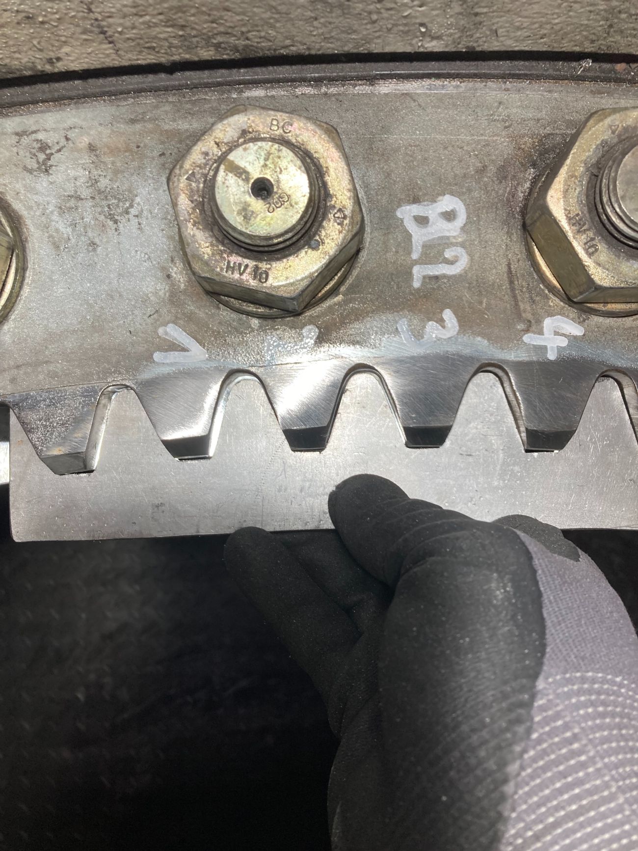 Der Zahnkranz besteht aus Vergütungsstahl, der konstruktiv so ausgelegt ist, dass die Oberfläche hart und verschleißfest bleibt, während der Kern Schlagbeanspruchungen abfedert. Trotzdem führt jahrelanger Betrieb unter dynamischen Lasten zu Materialabtrag an den Flanken.